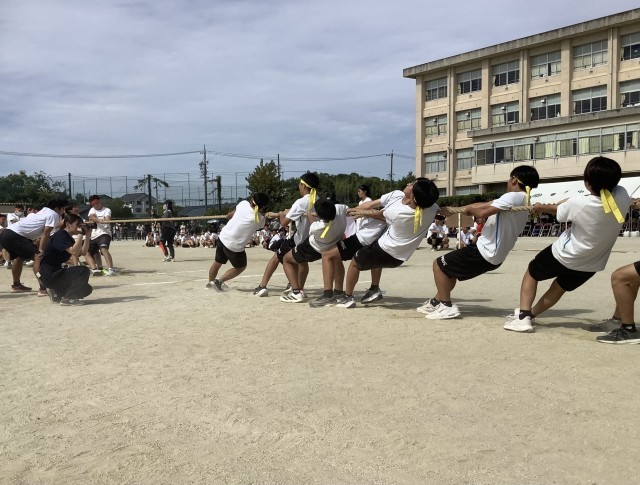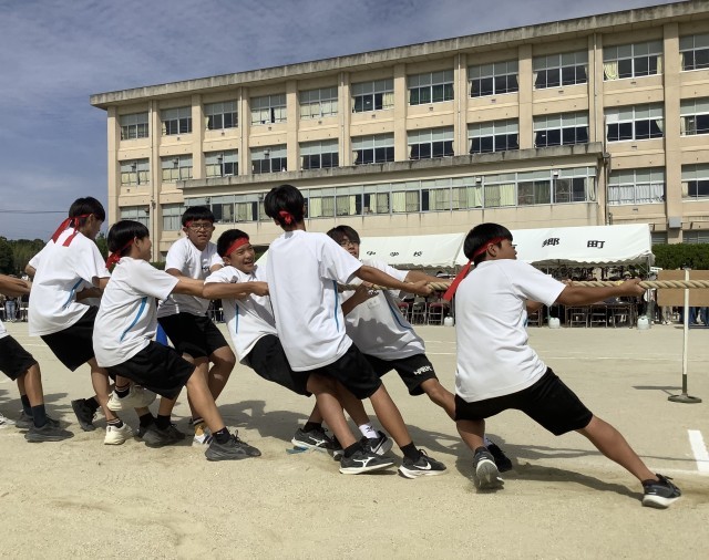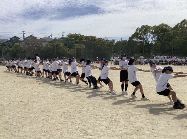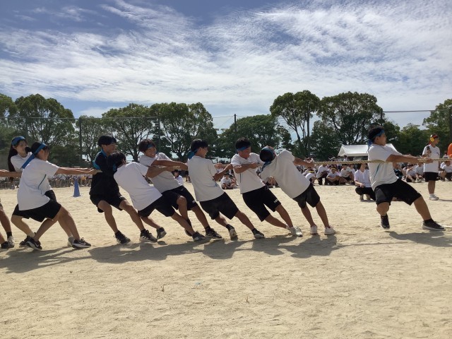 綱引きでは各クラス相手を替えて2回行います。なかなか勝敗のつかない接戦もありました。姿勢を低くししっかりと縄を引きます。勝ったときに思わず大喜びでジャンプしている姿は一生懸命の証です。