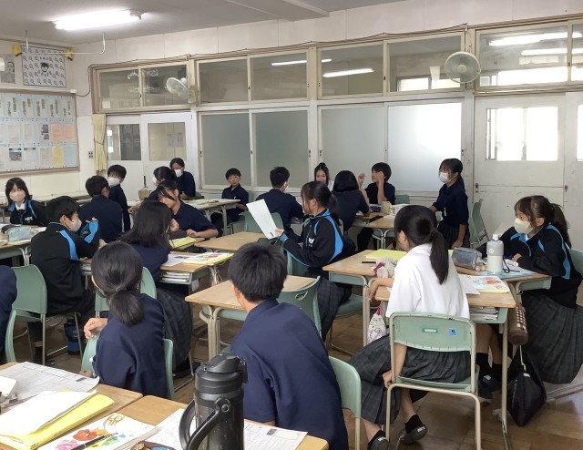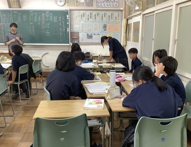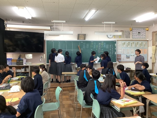 10月8日、1年生が国語「星の花が降るころに」の心情について、考えました。ワークシートに書き込み、班で話し合って、黒板に代表者が書いて発表します。