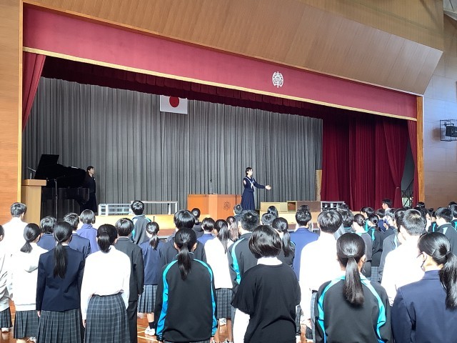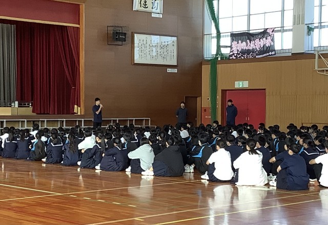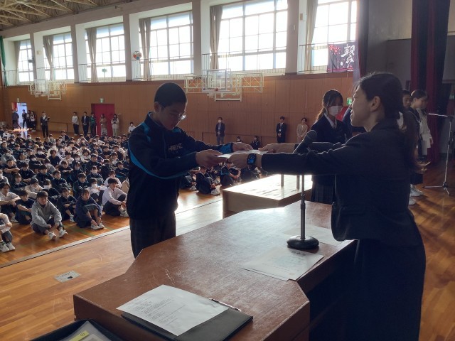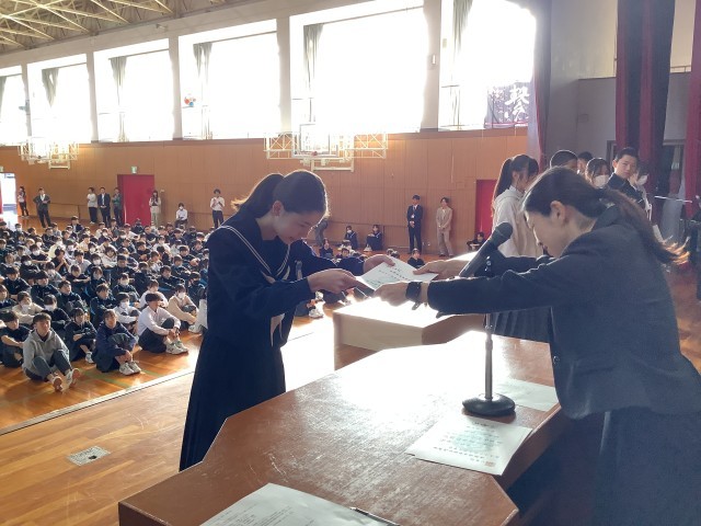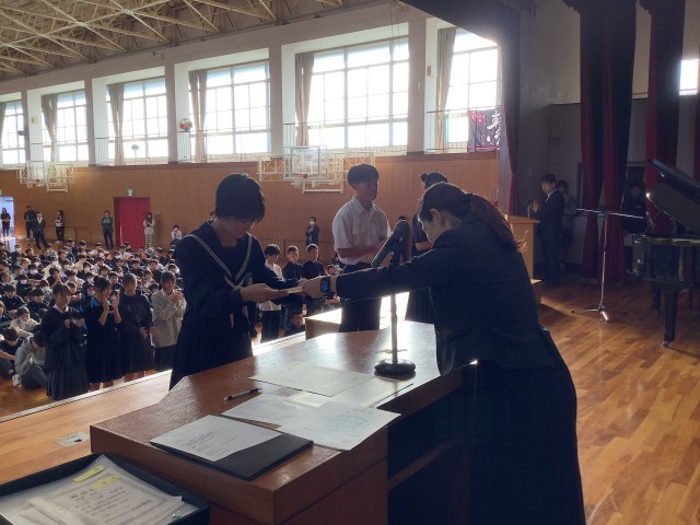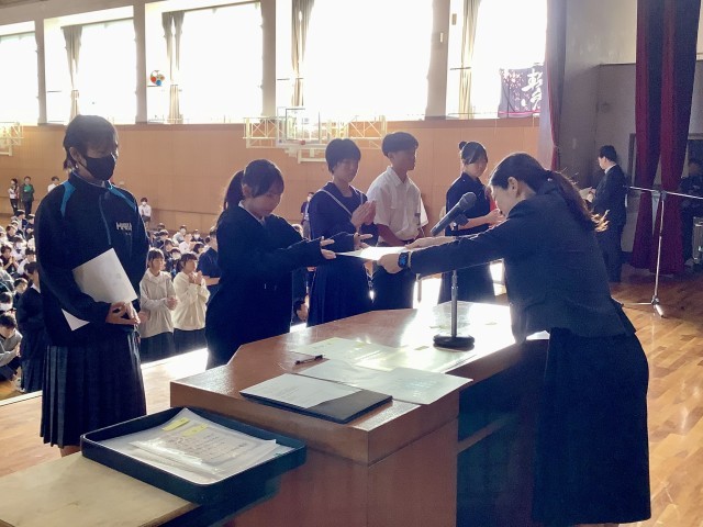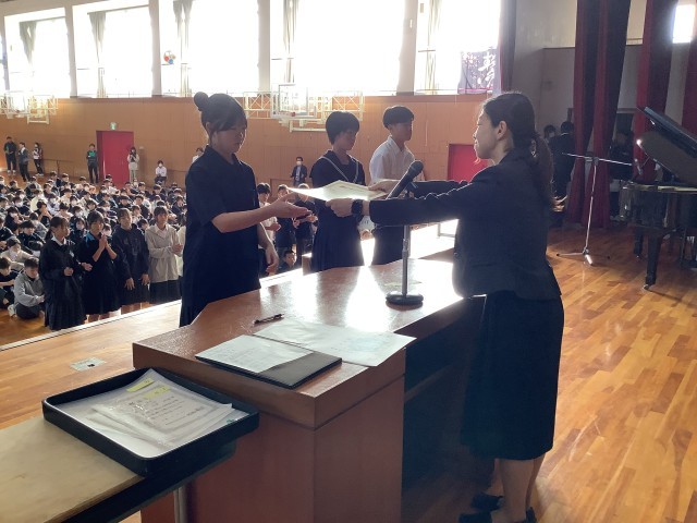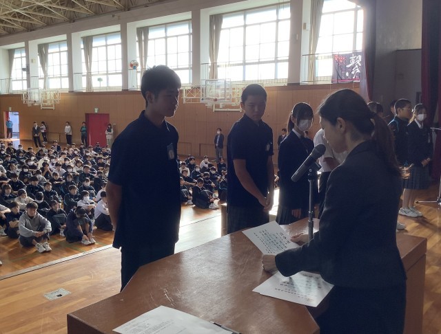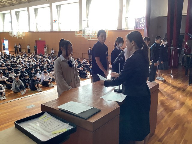 10月27日、朝会を行い、部活動と作品募集の表彰を行いました。急に涼しくなってきましたが、部活動には頑張って取り組んでいます。今日は卓球部個人戦、陸上の駅伝、そして他に優秀な俳句の表彰でした。授業で俳句に取り組みますが、自分で考えた俳句を応募しました。とても多くの応募作品の中から選ばれました。友達とのやりとりを描いた温かい句でした。皆さんおめでとうございます。