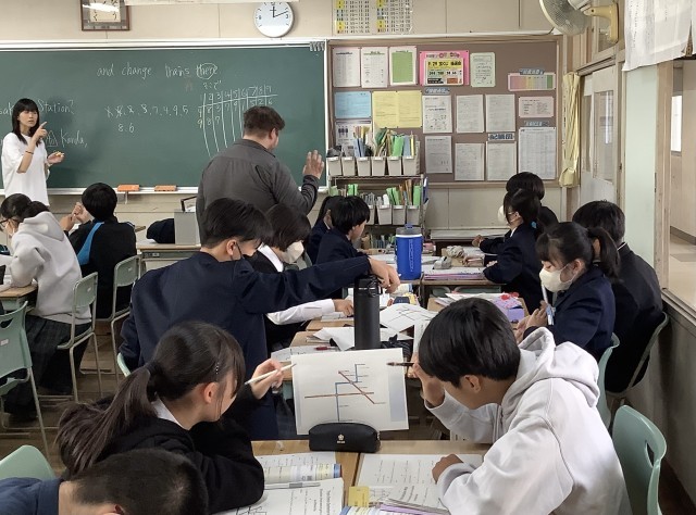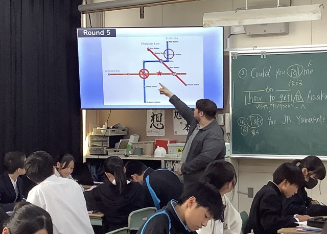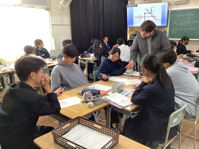 何問かの問いに班で答えを考えます。○○駅に行くには、何線に乗って、どこの駅で乗り換えます。のような英文の空欄に言葉を入れます。路線図を見ながら互いに相談していました。班別で競って、答えていました。