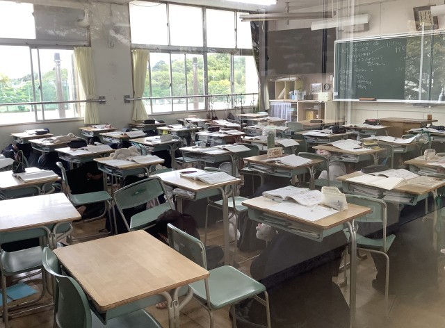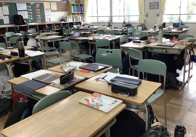 写真では、誰もいないように見えますが、生徒はすぐに身を守り、一時避難の体勢をとっています。地震が起こって大きな揺れがある時には、体を小さく丸めて落下物などから身を守る行動をとります。