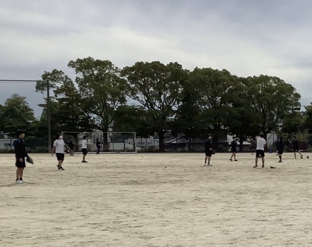キャッチボールを列になって行いました。慣れていない人にとっては難しそうですね。その後、トスを上げたボールをバットで打ち、ボールを受けとる練習をしました。