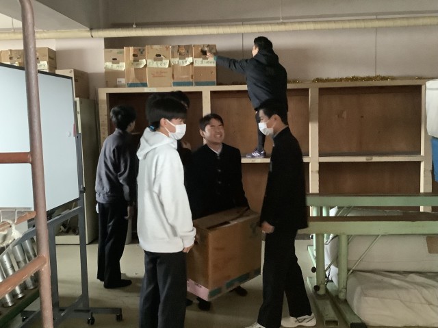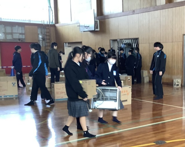 寒くなってきました。今日の最低気温は6度だったそうです。11月12日の清掃時に、各クラスにストーブと加湿器を配付しました。各クラス3人の生徒が体育館器具庫に取りにきてくれました。