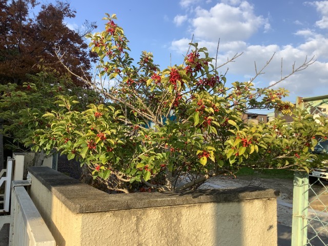 東門の両サイドには、クロガネモチの木が赤い実をたくさんつけています。その門を出てすぐ、学校の東側に公園ができるということで、東門前の道路が広がり、今整えられているところです。きれいになっています。
