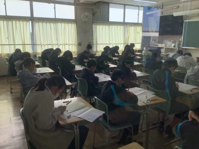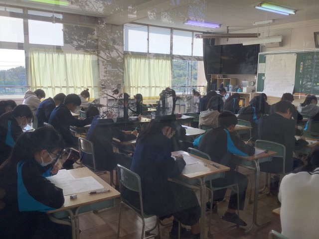 11月17日、全学年期末テストを行っています。登校途中に、手にプリントやワークなどを持ち、友達と確認して話している人を多く見ました。放課では内容を声に出しておさらいしていたり、試験中は放送問題に真剣に耳を傾けていたりして頑張っている姿が見られました。