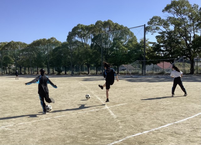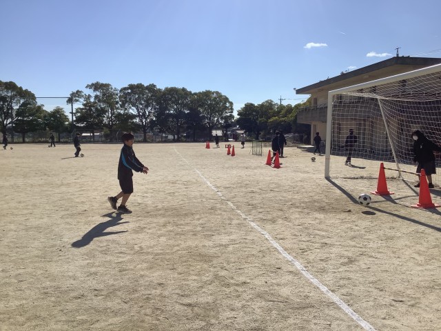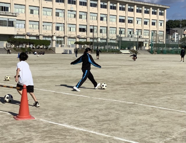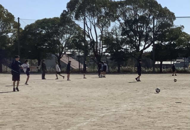 11月19日、1年生が体育でサッカーの練習をしました。運動場に2列で向き合って広がり、パスの練習をしました。あまり慣れていないせいか、まだあまり遠くまで飛ばすのは難しいようです。