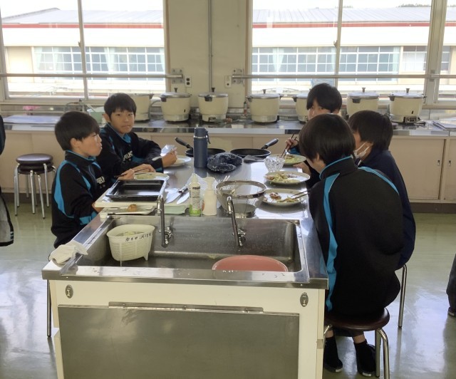 生姜じょうゆに浸した豚肉をフライパンで焼いていきます。ジュージューといい音、いい匂いがしてきます。美味しそうなしょうが焼きが出来上がりました。「美味しいー‼︎」成長期の中学生に良いメニューだと思います。とにかく皆が気づいて協力して進めているのに感心しました。後片付けもぴかぴかです。