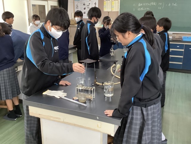 11月28日、1年生が理科の授業で、塩化ナトリウムと硝酸カリウムを使って結晶を作る実験をしました。それぞれを別の試験管に水と入れ、熱します。それを冷やすときれいな結晶ができます。