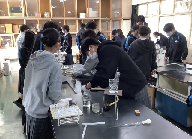 生徒は水を5mL取るために、何度もピペットを握り、慎重にしていました。ビーカーの水を温めるときにガスバーナーを使いましたが、ホースを取り付け火をつけるときには、もっと慎重にしていました。班で協力して行いました。
