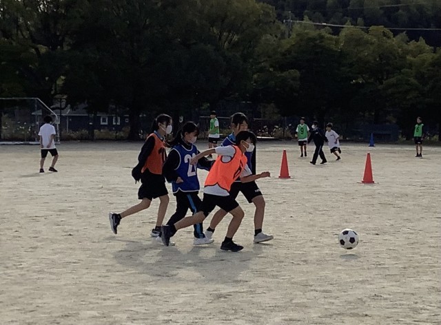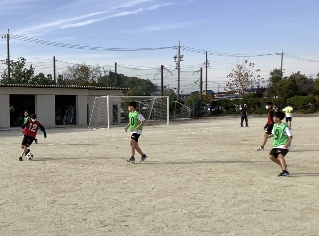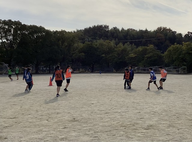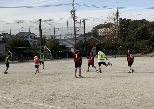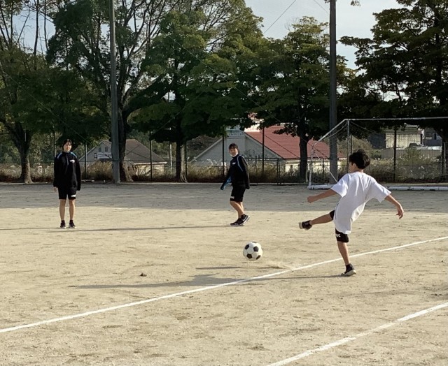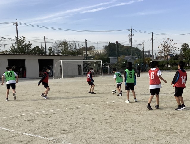 12月1日、1年生が体育でサッカーをしました。本当のゲームに近づいてきましたが、今日はゾーンゴールゲームというそうです。ゴールキーパーではなく、幅広のゾーンにポストマンがいて、仲間からのパスをポストマンがゾーンの中で止めると得点です。これは、ゲームの時に最終のシュートをする仲間に適切にボールを送る練習だということです。
