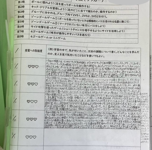 日差しがとても暖かい日になりました。男女混合チームですが、上手くボールを回していました。「いいよいいよー」「こっちー‼︎」と元気な声が響いていました。振り返りのノートに、びっしり書いてあるのに驚きました。