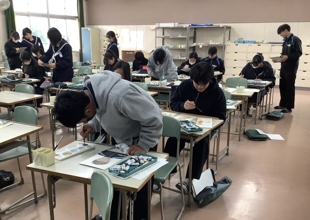 12月17日、3年生が美術で自画像を描いていました。何時間も構成や背景なども考えて進めてきました。今日はもうすぐ完成というところです。