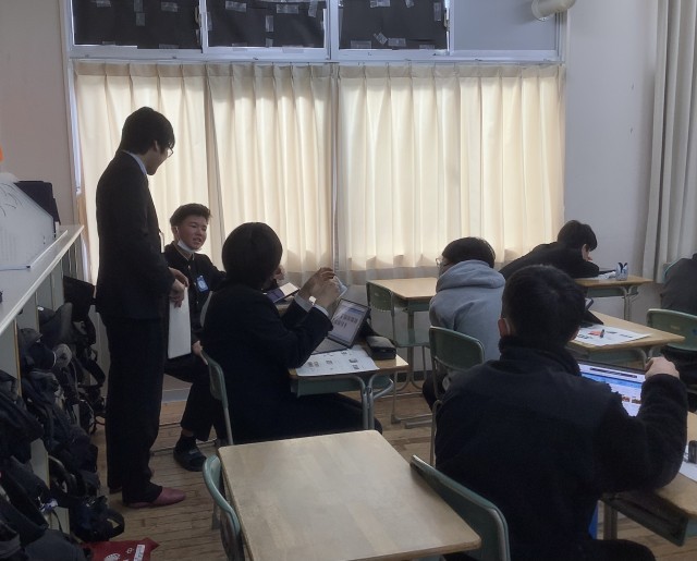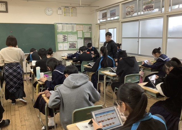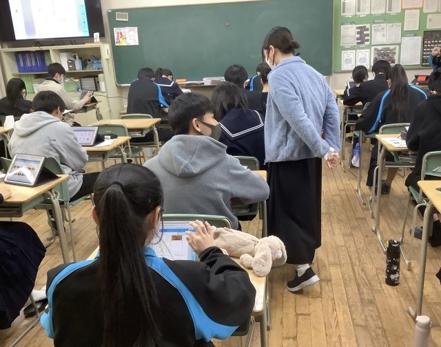 中学生のお弁当箱の大きさの目安や主菜、副菜、主食のバランスを学び、その後タブレットを使って自分なりのお弁当メニューを考えました。