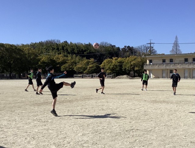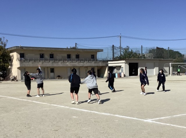 アルティメットでは風の影響を受けやすいので難しそうですが、短いパスを送り、得点につなげていました。ソフトテニスではペアを組み、やはりゲーム形式で、しっかりサーブを行っていました。サッカーでは時々歓声が上がり、楽しながら進めていました。