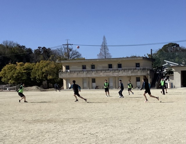 2月19日、日差しは暖かでしたが、冷たい風が吹いていました。運動場で3年生が体育を行っています。