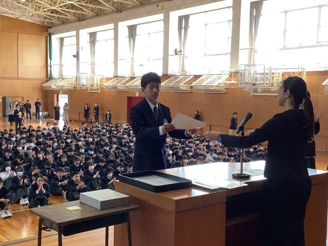 修了式では、学年の代表生徒に修了証を渡しました。今年度を振り返ってみると、様々な分野で活躍している多くの人がいます。皆さんも自分の強みを生かし、さらに成長していってほしいと伝えました。