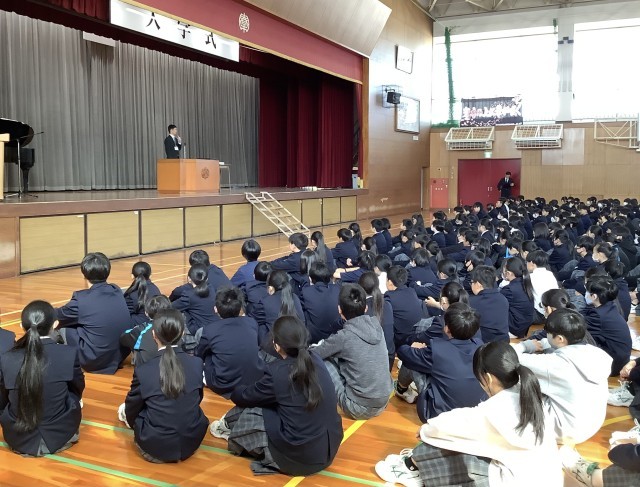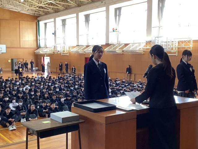 次に、令和8年度前期生徒会役員の任命を行いました。会長、副会長、役員の皆さんが、しっかりとした姿勢で壇上に上がりました。今までの生徒会も、春中の生徒のよりよい生活のために、考え、計画し、実行してくれました。その気持ちがとても嬉しいです。