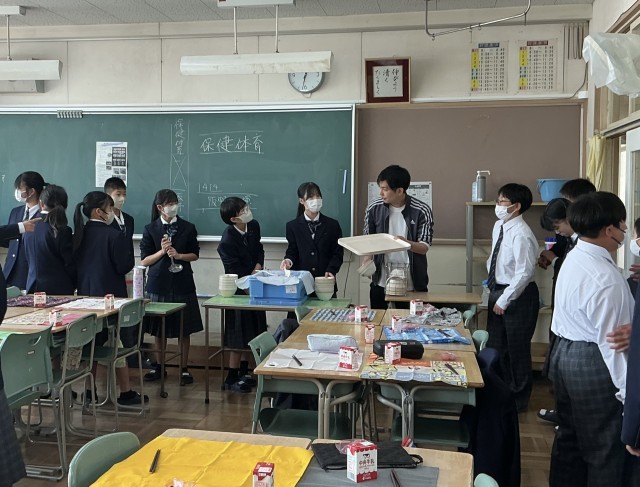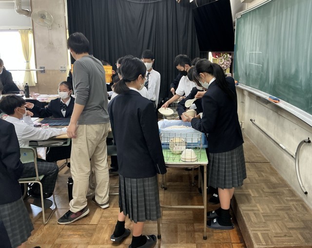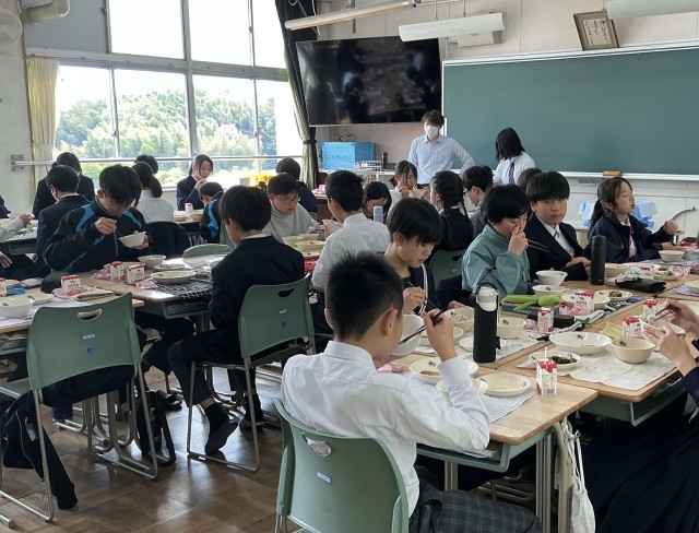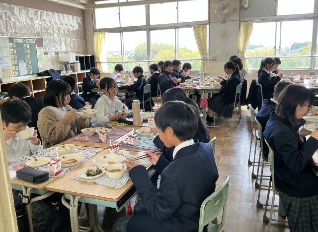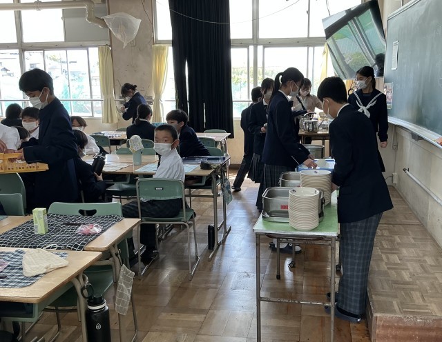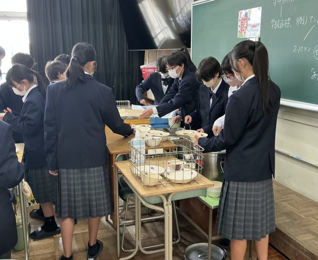 1年生も準備は慣れていますが、やり方が違うところもあり戸惑う人もいました。一人一人が自分のやることを周りを見ながら進めました。どのクラスも新しいメンバーで食べる初めての給食です。明日からも、もりもり食べてくださいね。