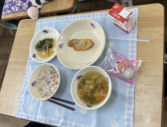 4月14日、給食が始まりました。メニューは、入学・進学おめでとうの赤飯と、ホキという魚のフライ(米粉で衣がつけてあるそうです)、ほうれん草ともやしの和物、湯葉のすまし汁、おめでたい紅白だんごもありました。