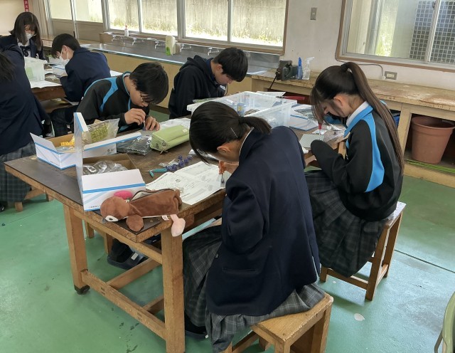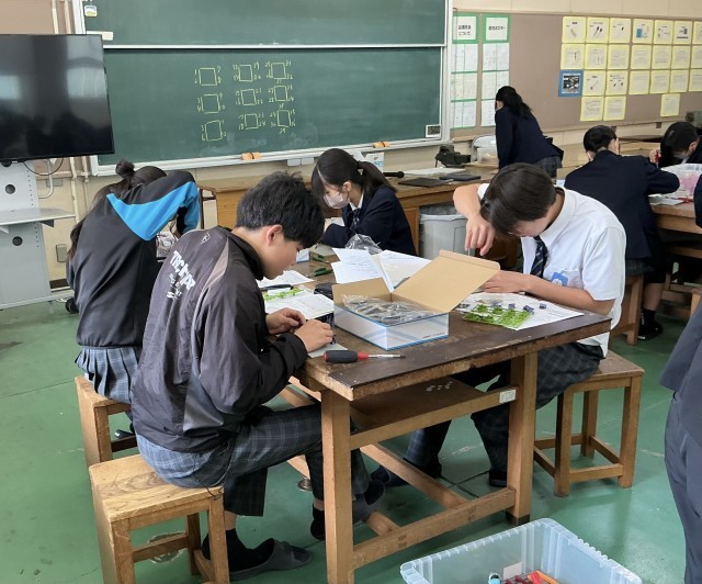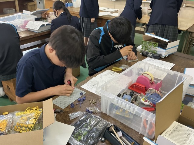 3年生が技術でロボコンを製作していました。基盤のプラスティックの板に、部品を小さなネジで取り付けていきます。押しながらドライバーを回さなければいけないようで、かなり力がいる作業でした。