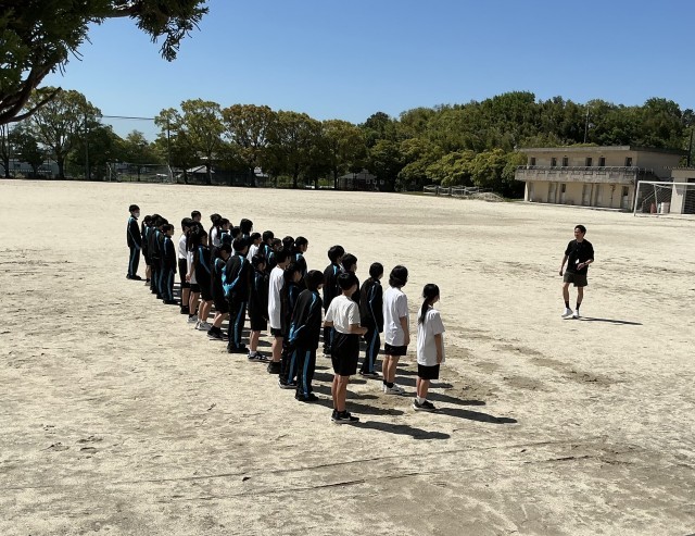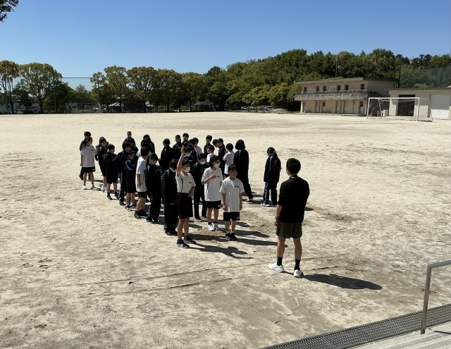 4月16日、1年生が体育で集団行動の練習を行いました。列になって並ぶ時の姿勢や並び方の基本を学びました。